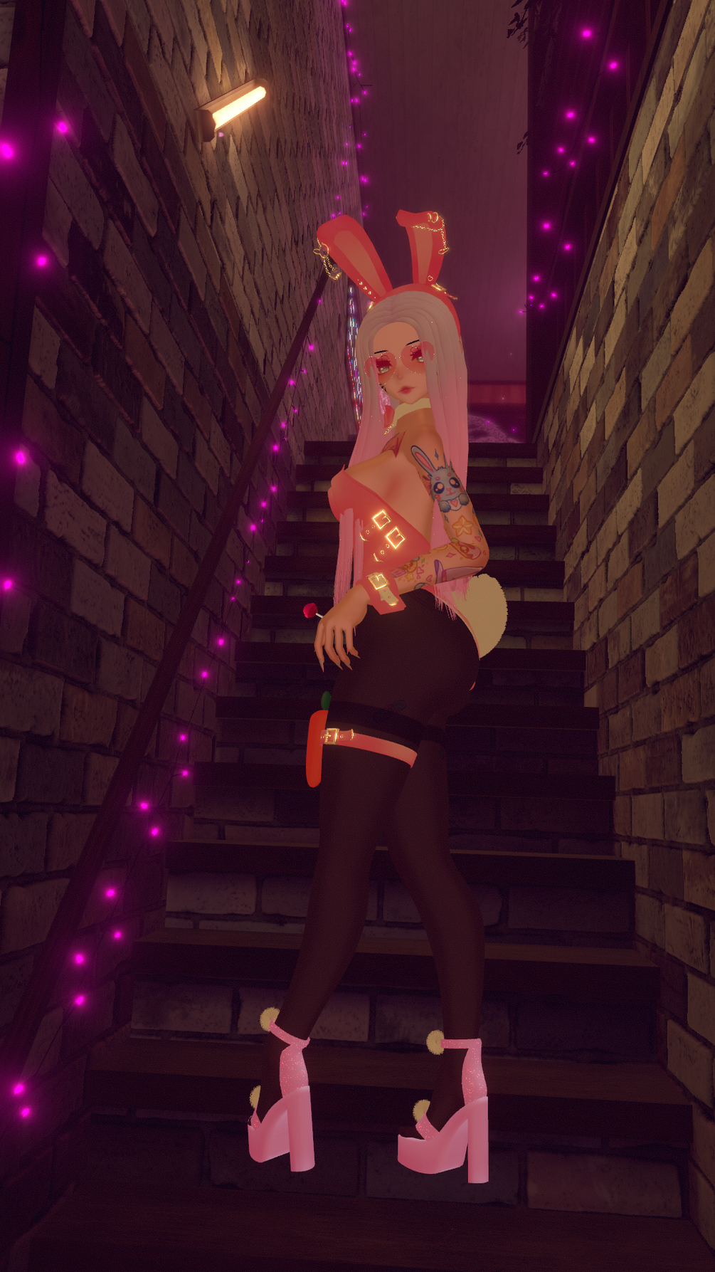 Props to play with; lollipop in mouth, hand or off. Carrot on leg, in hand or off. Heart wand on or off.